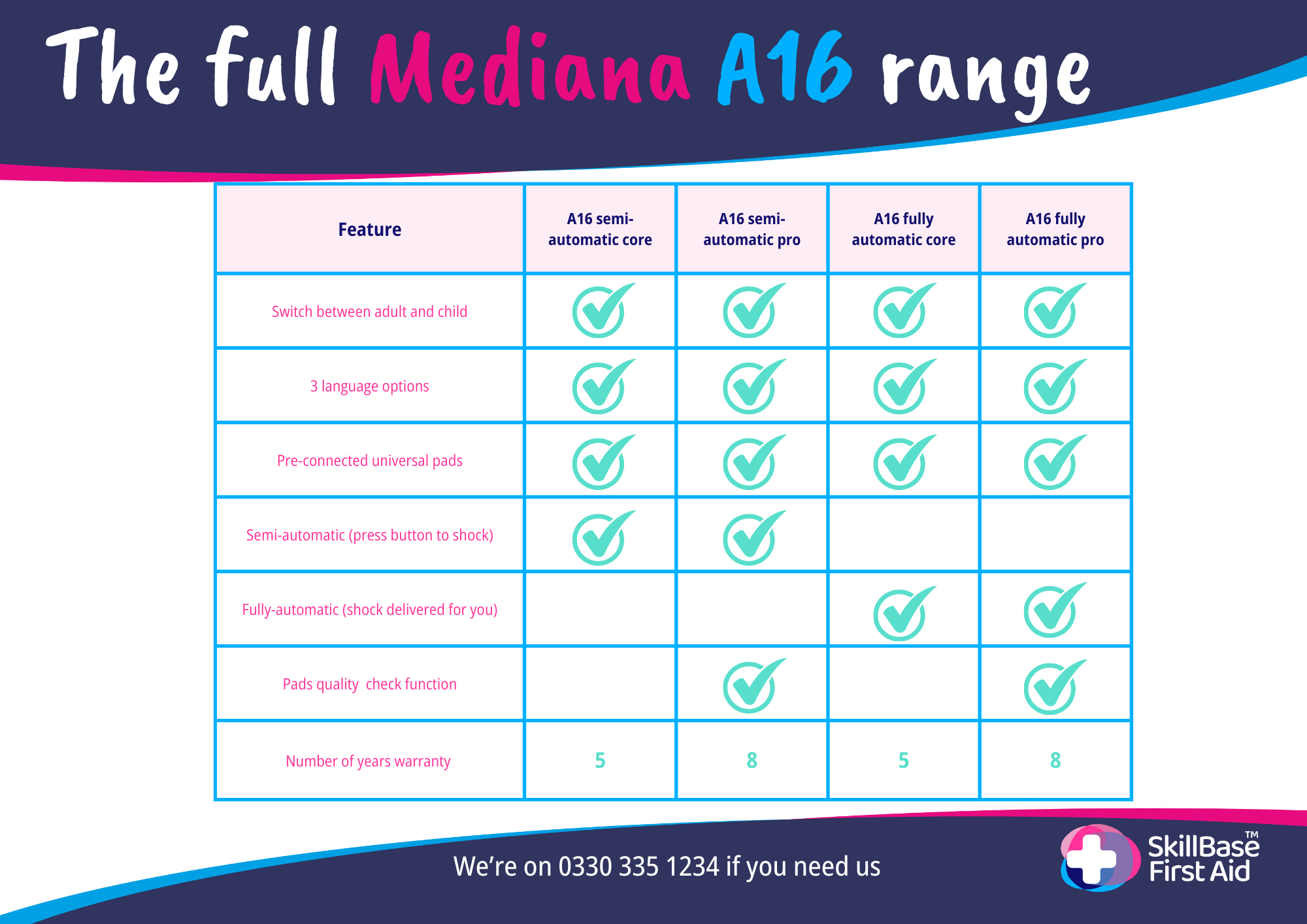 The A16 AED from Mediana is available in both fully and semi-automatic options. With 3 pre-loaded languages, English, Welsh and Polish, the ability to change from adult to child mode at the touch of a button as well as being rated to IP55, it is ideal for use in a variety of locations and environments such as workplaces, schools or for public use.
