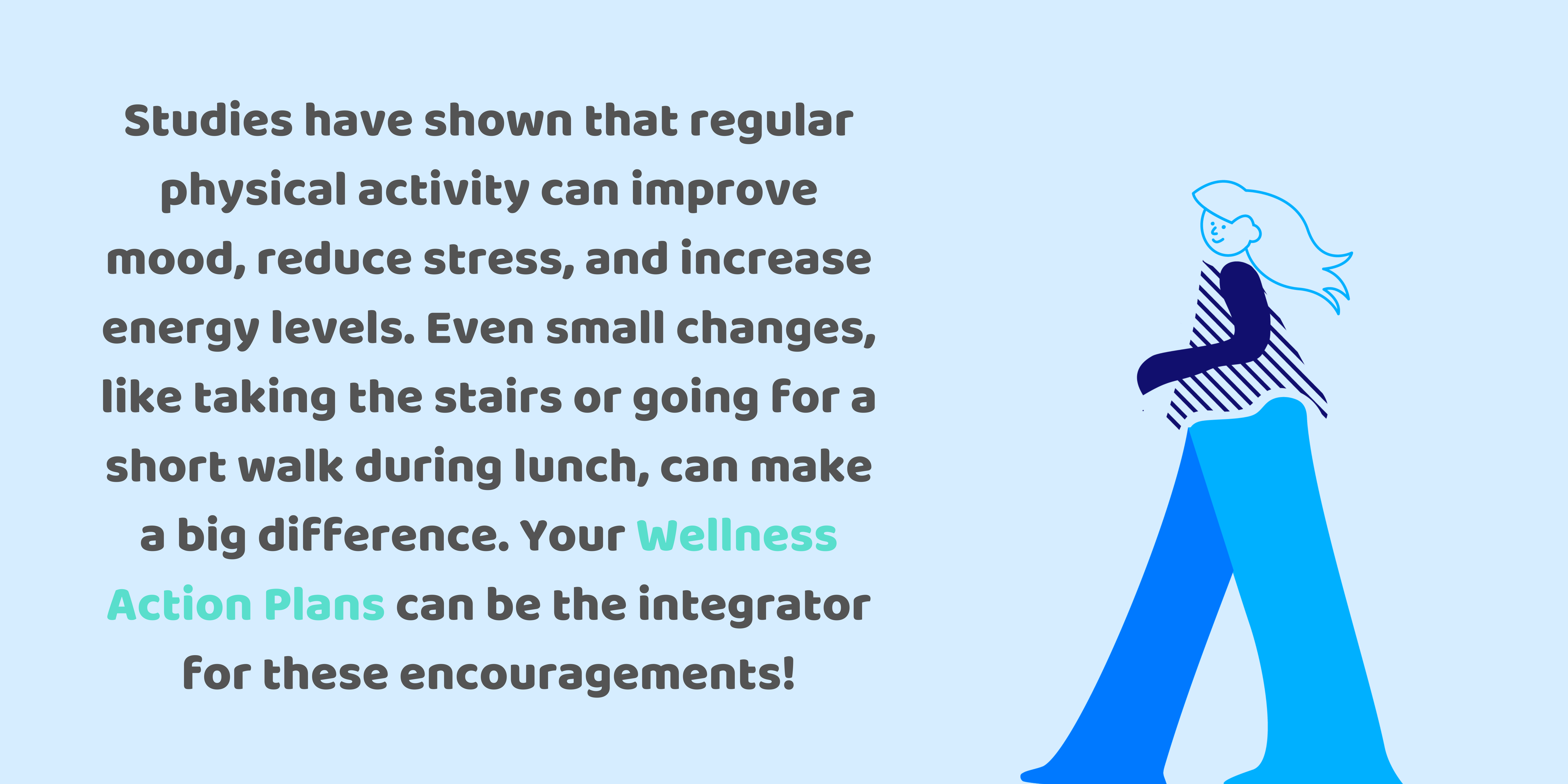 - Movement: Encourage movement breaks throughout the day to combat the negative effects of prolonged sitting. Suggest walking meetings, both virtual and in-person. Additionally, consider offering or promoting wellness education resources on topics like exercise, healthy eating, and stress management. Studies have shown that regular physical activity can improve mood, reduce stress, and increase energy levels. Even small changes, like taking the stairs or going for a short walk during lunch, can make a big difference. Your WAPs can be the integrator for these encouragements!